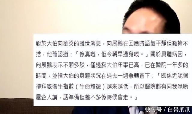 他的侄子向展鹏在接受媒体采访的时候透露,大伯其实住院已经有一年多的时间了,最后那个礼拜生命体征越来越弱,医院的治疗仪器已经没有办法维持下去,家人们其实早就做好了心理上的准备。