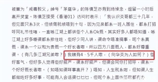 另一位到场的陈慎芝在接受采访的时候表示,他认识炎哥已经三十多年了,虽然见面的次数并不是很多,但炎哥是一个很懂礼节的人。